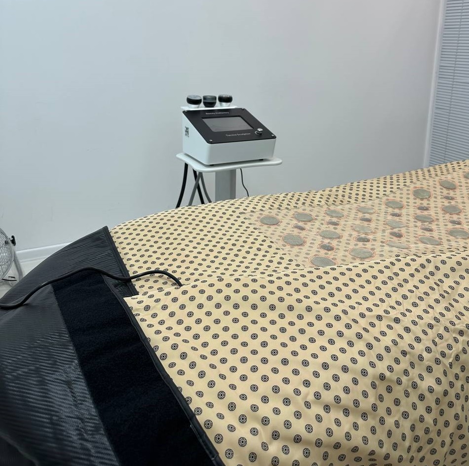Термопроцедура: проводится с помощью инфракрасно-прогревающего одеяла, которое расширяет лимфатические и кровеносные сосуды, улучшая снабжение кровью и кислородом всего организма и активизируя обменные процессы.